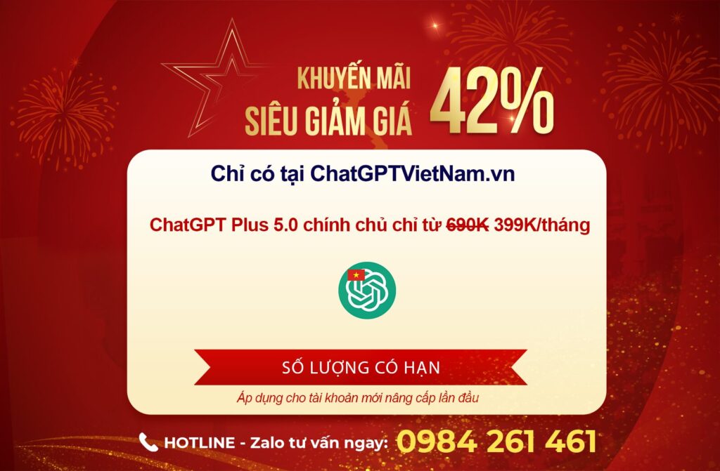 Chào mừng Quốc khánh 2/9, nhận ngay ưu đãi đặc biệt cho tài khoản ChatGPT Plus 5.0: chính chủ chỉ 449k/tháng, dùng chung chỉ 149k/tháng. Áp dụng cho đăng ký mới, thanh toán 3 tháng